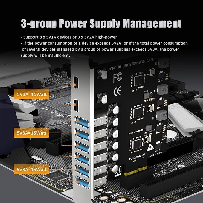 それぞれ5V3A(Type-C 1-2、Type-A 3-5、Type-A 6-8)を供給する3グループの電源管理により、8台の5V1Aデバイス、または産業用カメラ、VRシステム、USB 3.0 NVMEエンクロージャのような3台の5V2Aハイパワーデバイスをサポートすることができる。