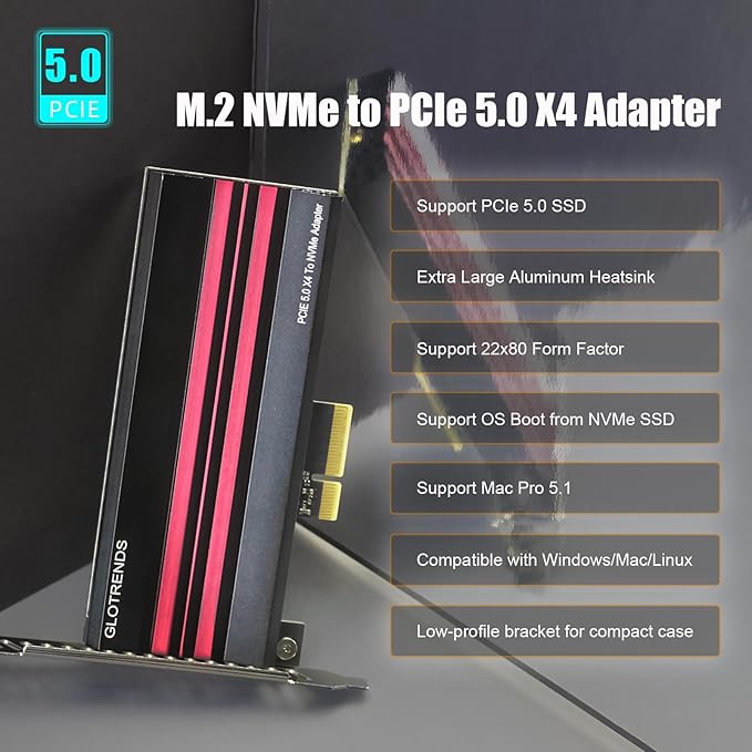 GLOTRENDS PA19 M.2 NVMe - PCIe 5.0 X4アダプタ、M.2 NVMe SSD用、大型アルミヒートシンクカバー、レギュラー/ロープロファイルブラケット