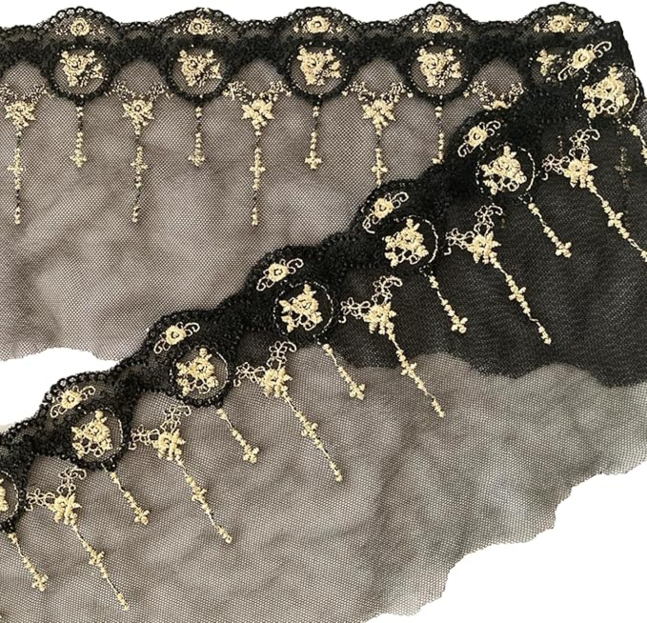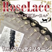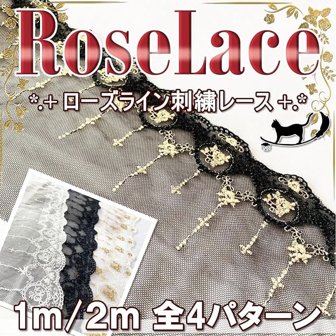 緻密な刺繍で織りなす、クロスとローズの魅惑的な模様のレーストリムです。【カラー】ブラックゴールド【サイズ】幅約15㎝/刺繍幅約10㎝ 長さ約2m【重量】約36g