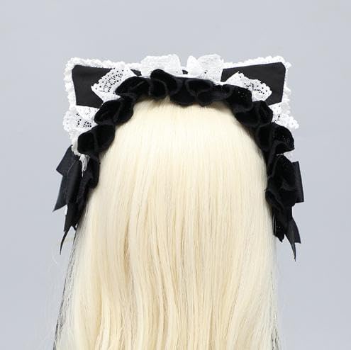メイド風 ヘッドドレス ボンネット風 レース付き リボンカチューシャ 髪飾り レース リボン フリル クラシカル ロリータ ゴシック 黒白 ブラックホワイト 文化祭 学園祭 ハロウィン用 コスプレ用 | etshop