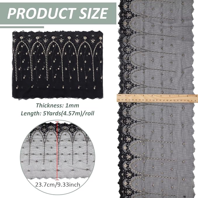BENECREAT 5ヤード/4.57m レースリボン ブラック 237mm幅 刺繍リボン 幅広刺繍レース縫製トリム ゴスロリ風 ロリータ コスプレ DIYクラフト縫製、服装装飾、衣装小物、ウェディングドレス用