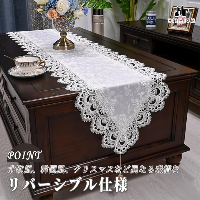 【繊細なレース刺繍】上品なレース刺繍が、普段の食卓はもちろん、お洒落なパーティーシーンまで華やかに彩ります。リバーシブル仕様で、北欧風のインテリアや韓国風の優しい雰囲気、クリスマスの飾り付けなど、気分に合わせて異なる表情をお楽しみいただけます。