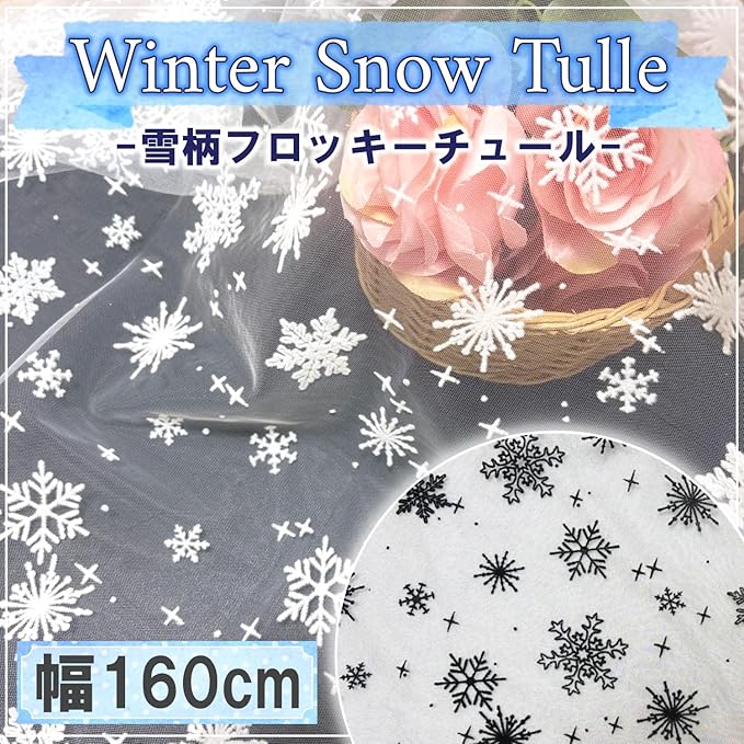 ふんわり軽やかなチュールに、立体感のある雪柄のフロッキー加工を施しました。季節に関係なくお洒落な雪の結晶のデザインで、ハンドメイドが一層華やかに。