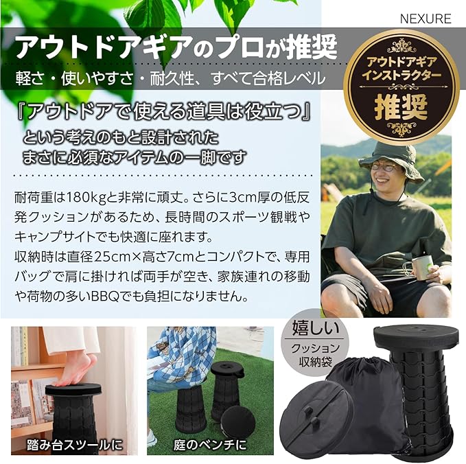 【伸縮スツール 折りたたみ椅子 3cm厚クッション/収納バッグ付】NEXURE 軽量 コンパクト 持ち運び 伸縮式 耐荷重180kg 高さ調整可能 キャンプ スポーツ観戦 運動会 ファミリー 日本語説明書付き | etshop