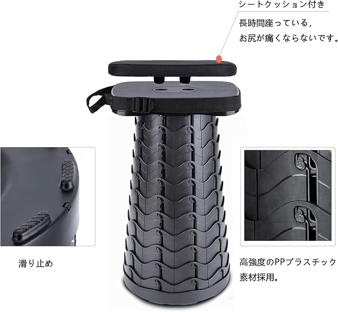 折りたたみ椅子 アウトドアチェア 伸縮式 キャンプ椅子 折り畳み式 キャンプスツール 軽量 コンパクト 持ち運び便利 耐荷重220KG 一秒開閉でき 高さ調整可能 6.5-45CM 滑り止め 【意匠登録】シートクッション 収納バッグ付き (ブラック+角型 + シートクッション) | etshop