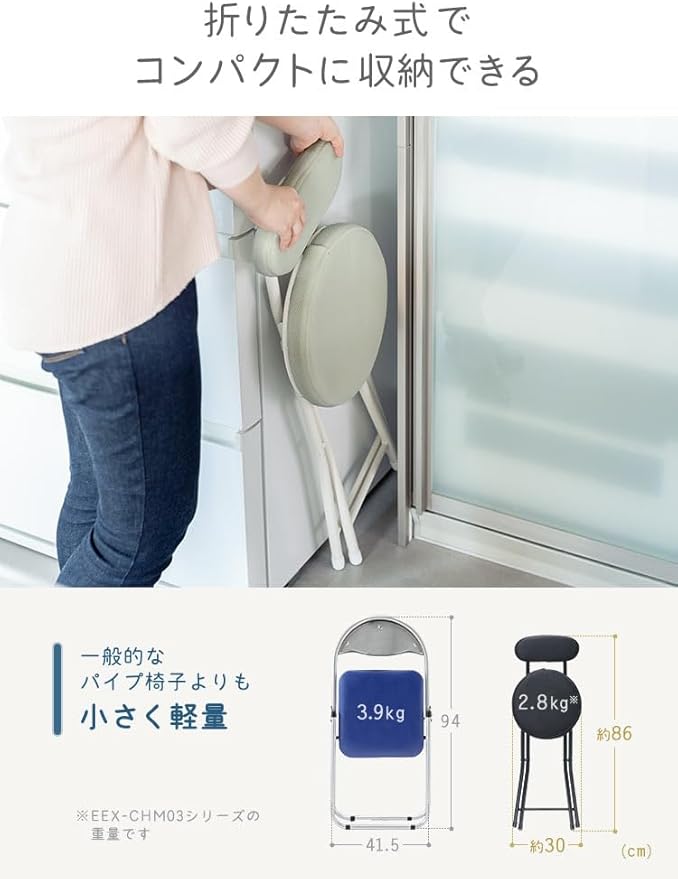 【軽くてスリムなサイズ感】横幅約30cm、重さは約2.8kgと、一般的なパイプ椅子よりも、さらにコンパクトになっています。