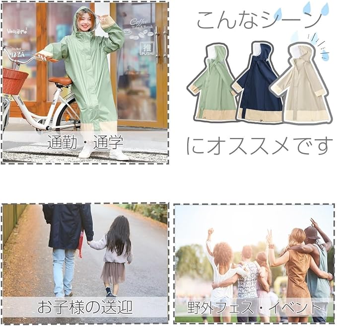 便利な機能が満載の快適かつスタイリッシュなレインコートです。日常での使いやすさを重視し、通勤通学、自転車運転、リュックを背負ったままの着用も、雨の日でもストレスなく過ごすことができます。背面の身幅調整プリーツによりリュック対応だけでなく、体格や衣類の厚みの心配もなし。どんなファッションにもマッチするロング丈のお洒落なレインコートです。