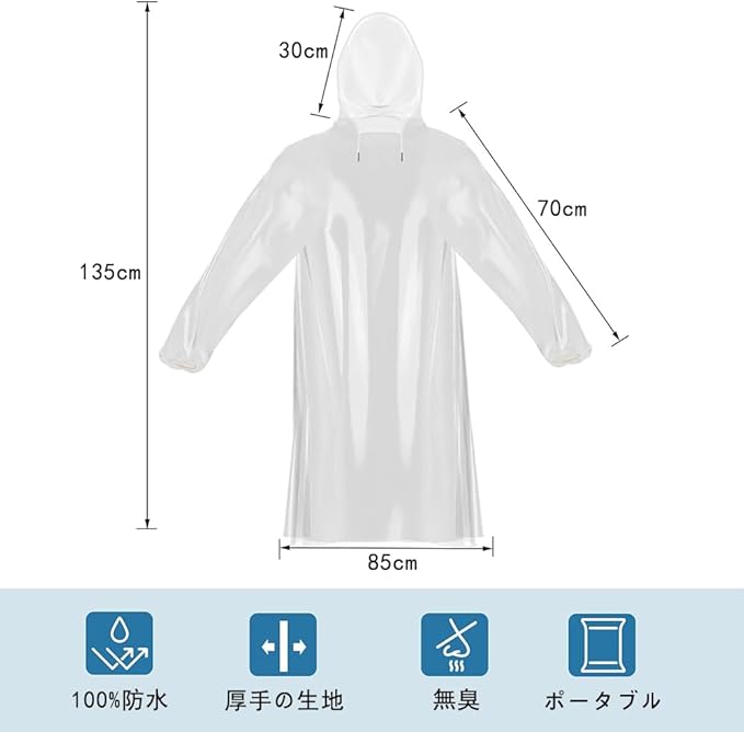 【軽量で携帯性が高い】このレインコートは軽量で薄い防水PE素材で作られており、約45グラムしか重さがなく、持ち運びに便利で場所を取りません。