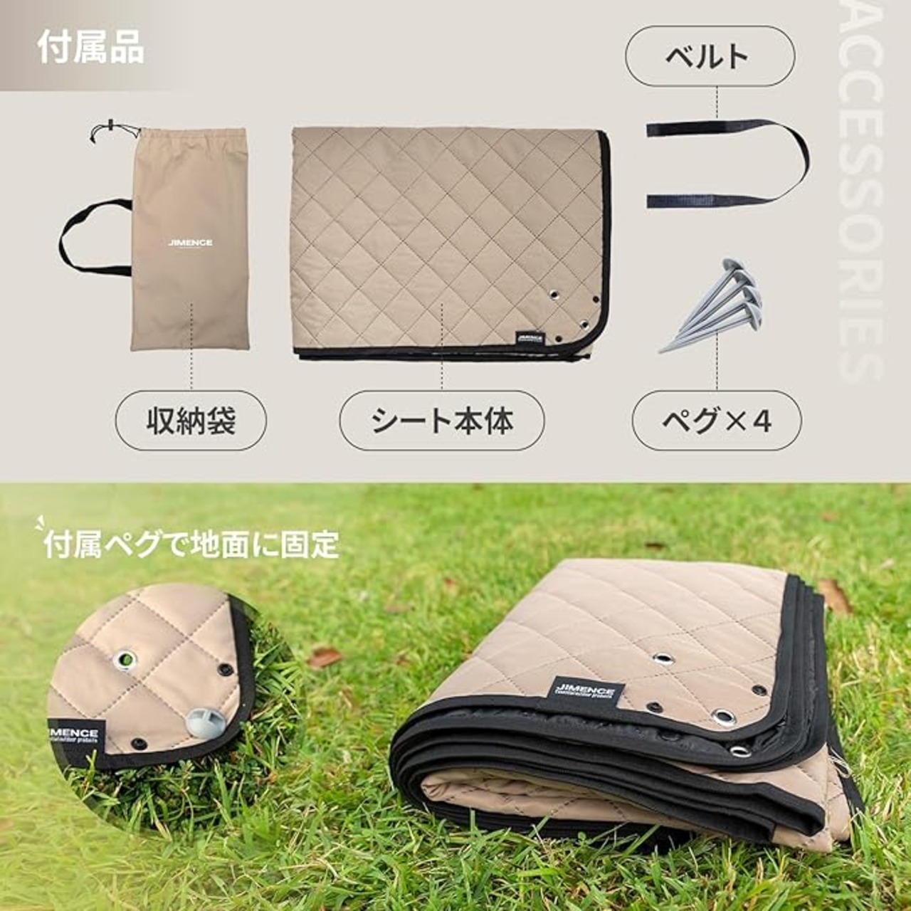 【素材】表面:シャリシャリの心地良い肌触りで通気性が良く、汗をかいた素肌で触れても”ぬるっ”としません。/中綿:中綿を詰めていますので軽度のクッション性があります。スポンジに比べて畳みやすく、通気性も良いのが特徴です。/裏面:防水加工(PUコーティング)を施していますので水たまりの上に敷いても染みません。ピクニックや日帰りレジャーならこれ1枚でOKです。
