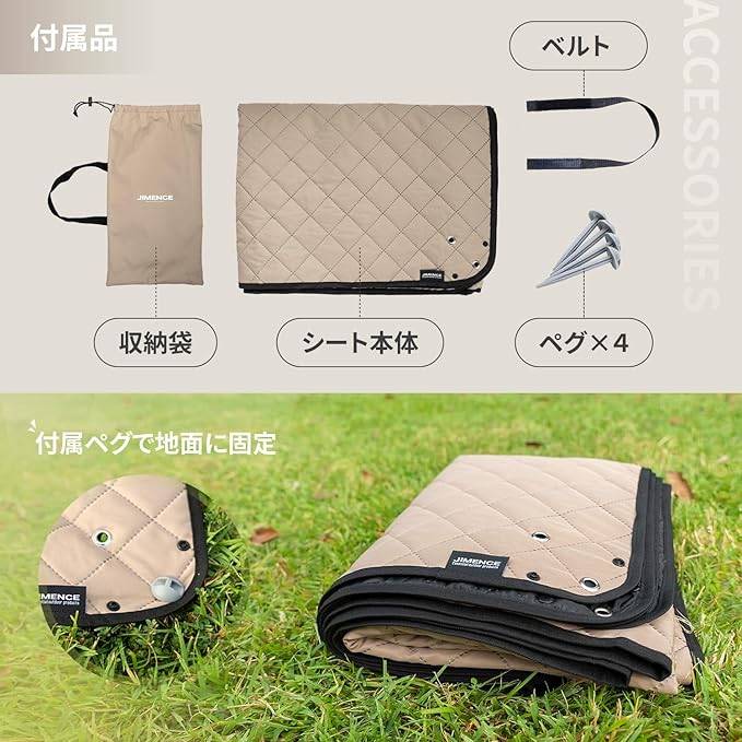 【収納袋付き】シート本体と同じ素材で出来た収納袋が付属します。シートに付いた土汚れを包み込めるので車内・家の中へ汚れを落とさずに済みます。持ち手付きなのでお子様でも負担なく持ち運べます。付属のペグ、ベルトを袋にまとめて保管できるため紛失しにくいのもメリットです。