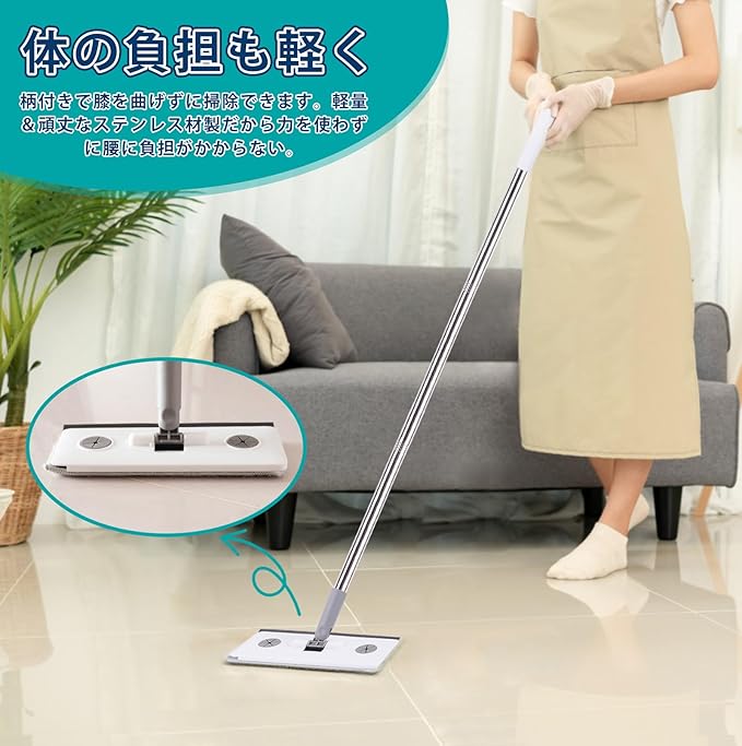 【ダブル繊維構造のモップパッドで床掃除にも楽々!】極細繊維とコシのある繊維の2種類構造なので吸水性、耐摩耗性、耐久性に非常に優れ、床面を傷つけずお掃除出来ます。フローリング掃除に対して、雑巾やマイクロファイバーよりも繊維が目地までしっかり届き、 汚れをキャッチすることができます。
