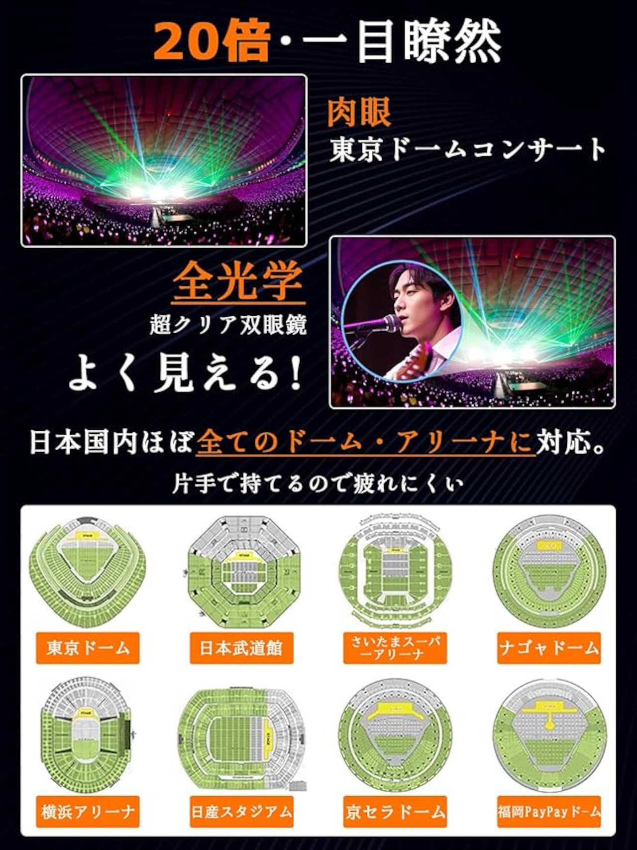 【 高倍率20倍 広視野75度 】双眼鏡 ライブ用は20倍のズームを備えており、ドーム、アリーナ、スタジアムなどの大規模な会場での使用に最適です!高倍率ズームと75度の超広視野により、遠くの座席からでもステージ上の表情を鮮明かつ広範囲に見ることができ、ライブパフォーマンスの臨場感を一層高めます。また、オペラグラスとしても使用可能で、お気に入りのアイドルのイベントにも最適です。