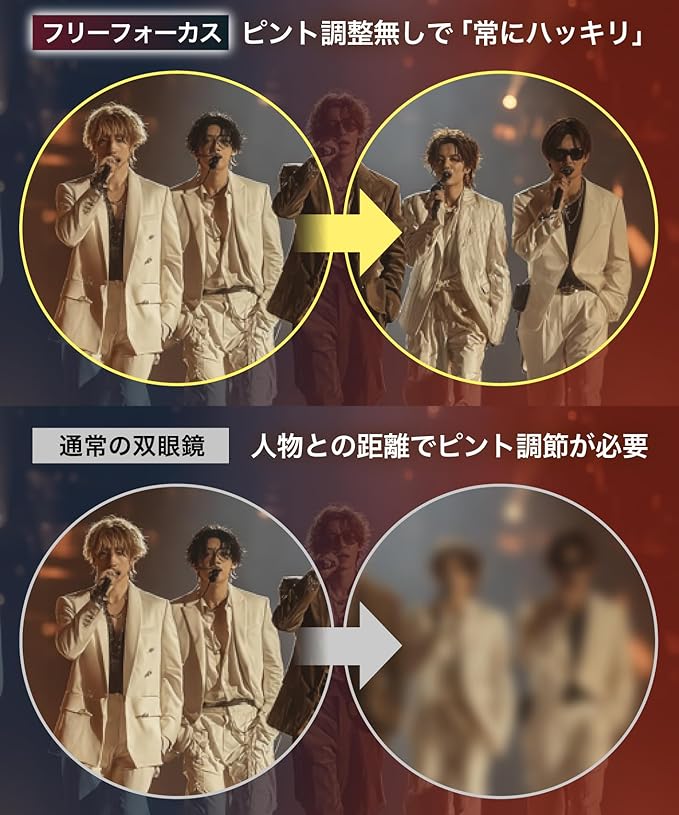 ⭕フォーカスフリーとは?✅通常の双眼鏡は対象を見るために距離に応じてピント調整が必要です。Preime双眼鏡は「コンサートで大切な瞬間や演者を見逃さないよう」常にフォーカスが合うような機能を搭載しました。これからは調整不要で見たいところを見れば、そのままクリアな映像が見られます。コンサートのために本気で作られた双眼鏡をお楽しみください。