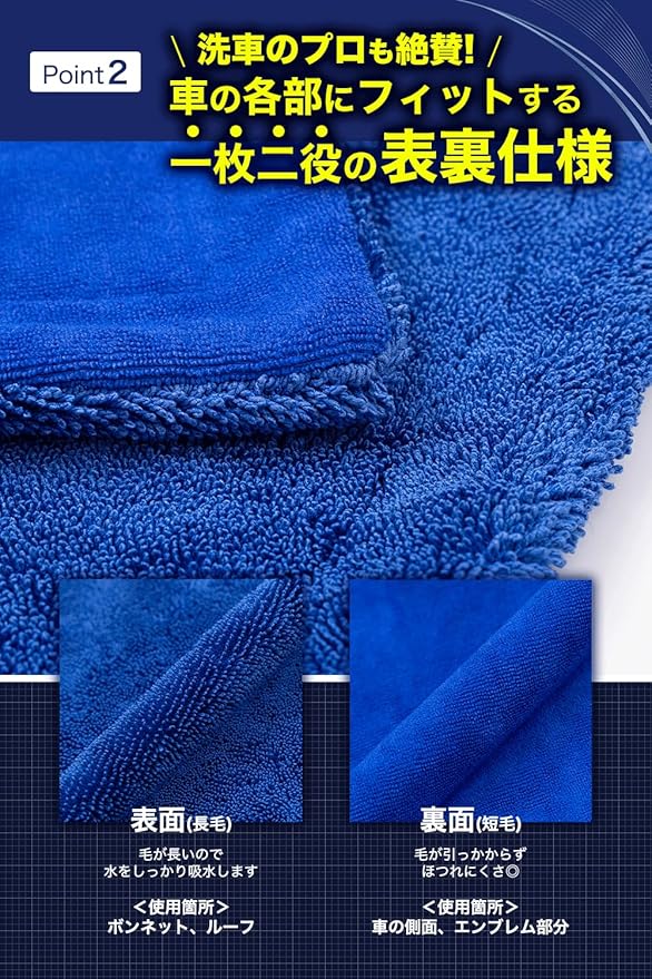 ✅【長毛 短毛のW構造|ボンネットから細部まで対応】表面は“長毛”で大きな水滴を吸水し、広い面をスピーディーに拭き取り。裏面は“短毛”で引っかかりにくく、エンブレム・ドアノブ周り・細部フィニッシュに最適。1枚で広範囲と細部仕上げの両方に対応します。