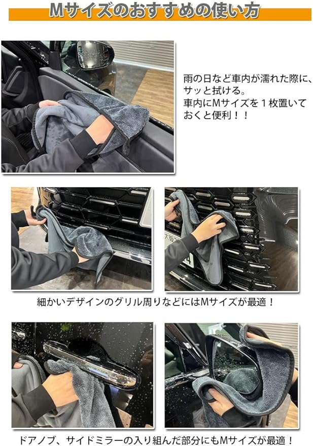 Lサイズの方は、大判サイズで素早く拭き上げができるのでSUVなどの大きなボディのドライングに最適です。拭き上げ時間短縮で作業効率もアップ。片面設計になっているので大判でも軽くてしなやかな拭き心地を体感できます。