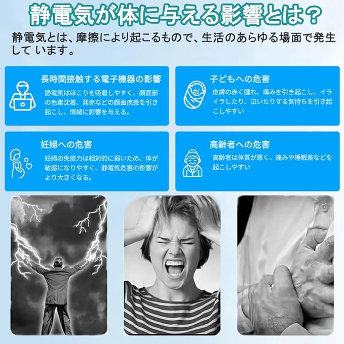 【幅広い用途&品質保証】乾燥した季節には、多くの生活や作業環境が静電気を引き起こします。例えば、ドアを開けるとき、金属物体との接触(部屋のドアを開ける)、衣類類の静電気、髪の毛の静電気などです。快適な生活を、静電気ゼロから始まる。年中使えるスポーツブレスレットとしても活躍。Nowotoで静電気除去ハンドループを購入すると,日本語の取扱説明書が付いているので、操作に心配は必要ありません。使用前にご参考ください。万が一初期不良と梱包破れが発生しましたら、カスタマーサービスまでお気軽にご連絡ください。