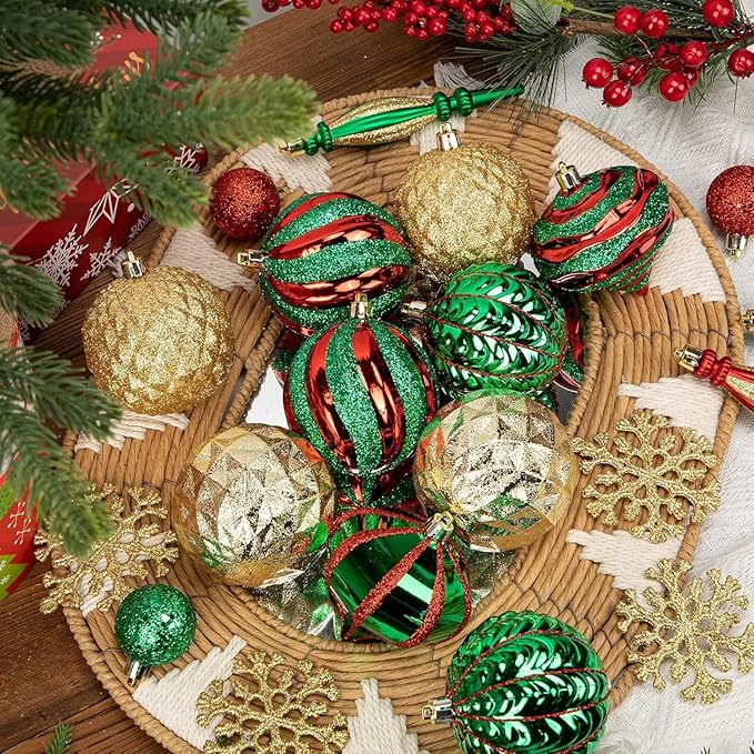 【高品質な素材と仕上げ】クリスマスシーズンを華やかに彩る、全部で50個のオーナメントセットです。情熱的な赤、深みのあるグリーン、輝くゴールドという、クリスマスを象徴する伝統的な配色が、お部屋全体を温かく包み込みます。セットには、存在感のある直径9cmのボール、可愛らしい直径5cmのボール、繊細な直径8cmの雪の結晶オーナメント、そしてユニークな長さ14cmの円錐形が含まれており、各形状が複数ずつ入っているので、統一感たっぷりにツリーを飾り上げられます。