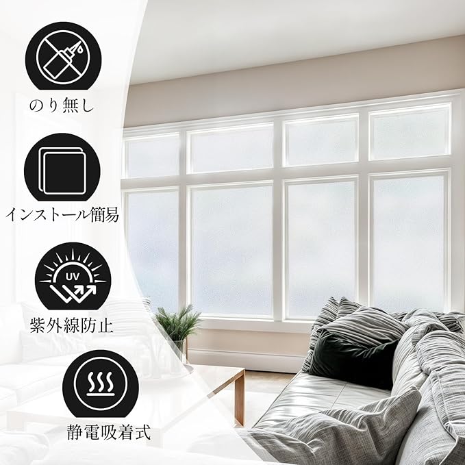 【目隠し、プライバシー保護】⇒ 20cm以上離れていれば、天気や昼夜を問わず、室内が見えにくいです。外からの視線を遮りながら、かつ、充分に外の光を室内に取り込めます。カーテンを閉めているときの閉塞感や窮屈感あるの暗い部屋から解放されるでしょう。透明窓ガラスをくもりガラスにできるお手軽シートです。