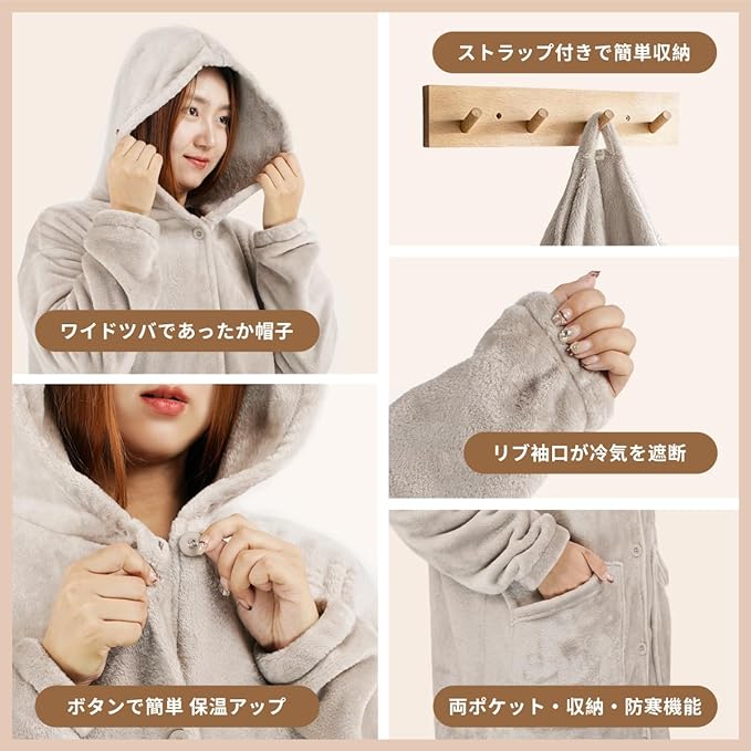 【便利で実用的】前開きデザインの着る毛布で、掛けひも付きで着脱が簡単。部屋着 暖かいのリブ編み袖口は寒さを遮り、家事の邪魔になりません