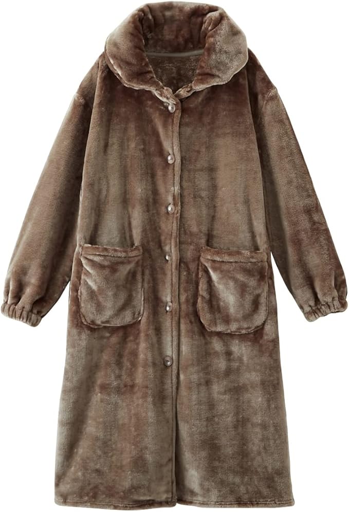 ■首回りもしっかりあったか たっぷりとボリュームのある襟付きなので首元まであたたかく過ごせます。 ■ガウンとしても着用できる ワンピースとしての着用だけでなく、ボタンを開ければガウンのようにパジャマの上から羽織ることもできます。