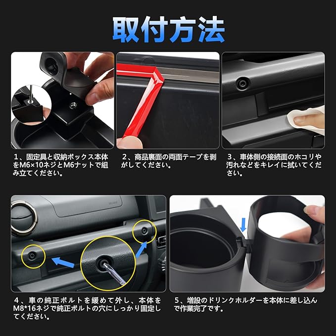 【製品詳細】素材:ABS樹脂、ゴム素材。セット内容:本体 1、増設用ドリンクホルダー 1、滑り止めマット 2、固定具(本体固定用) 2、M6*10ネジ 2、M6ナット 2、M8*16ネジ 2、コンビレンチ 1、日本語説明書 1。装着位置:助手席乗降グリップ