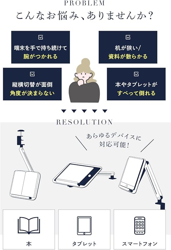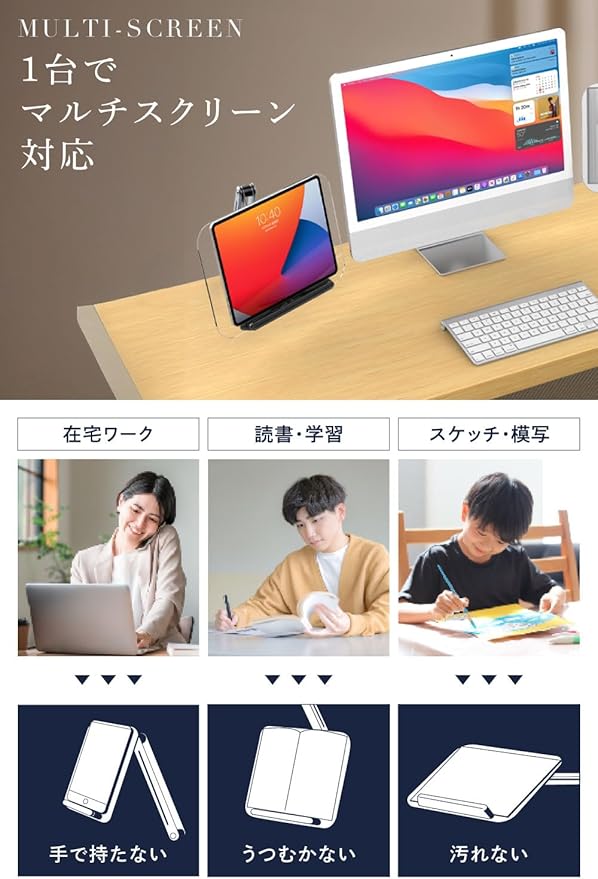 ✅【読書・楽譜・レシピ台などに幅広く活躍】 タブレットやPC以外にも、ブックスタンドや譜面台、レシピスタンドとして幅広く活用でき、学習、演奏、料理、動画視聴などさまざまなシーンで大活躍します。ページをしっかり固定するホルダー付きで、楽譜やレシピ本も手放しで閲覧可能。日常のさまざまな作業を効率化します。
