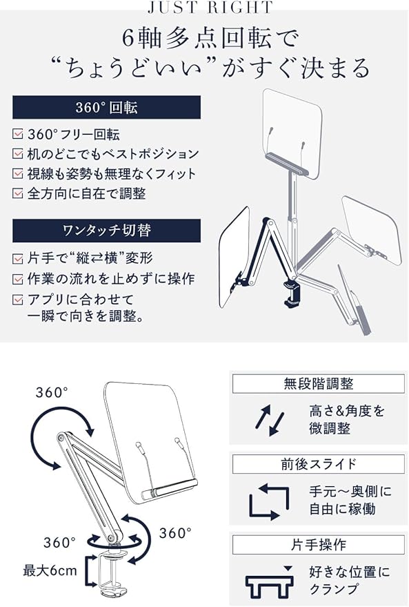 ✅【挟み込み固定式でしっかり固定】 デスクやテーブルに強力クランプで固定できるため、揺れやズレが起きにくく、安定した使い心地を実現するタブレットスタンドです。クランプ幅は調整可能で、さまざまな厚さのデスクに対応します。設置・取り外しも簡単で、使う場所を変えたいときも手間がかかりません。