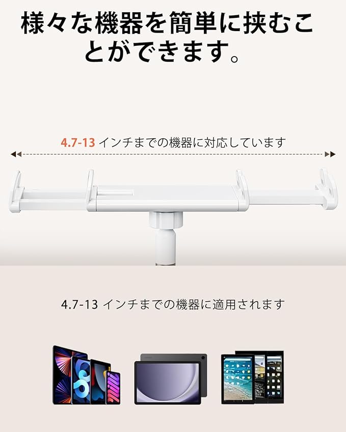 タブレットとスマホのスタンドが二つ合一:OATSBASF が新たに発売したクリップ式スタンドは、4.7~13インチまでの様々な機器に対応可能です(for iPad Pro,iPad air 2 3 4, iPad mini2 3 4,iPhone16/15/14/13,Sam-sung Tab Galaxy S8 S7 S6, Note 6 5,Android Nexus 7, Kindle,Huawei Media Pad)。