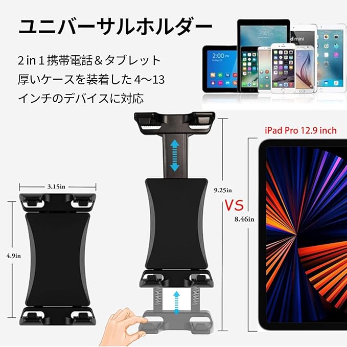 【幅広いデバイス対応】4.5インチのスマートフォンから13インチのタブレットまで、さまざまなサイズの端末を安定して保持。強化されたクランプと軟質パッドで、機材を傷つけずにしっかりとサポートします。