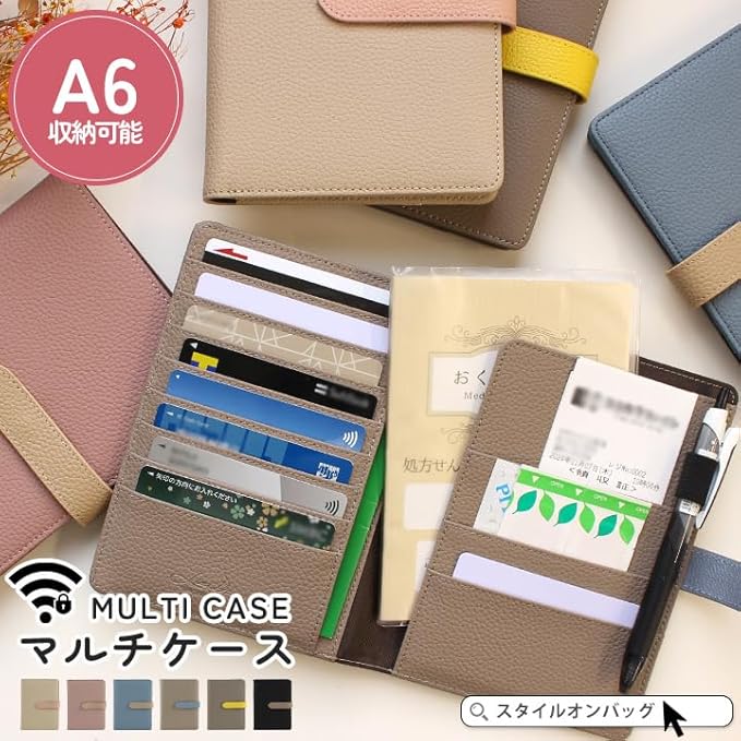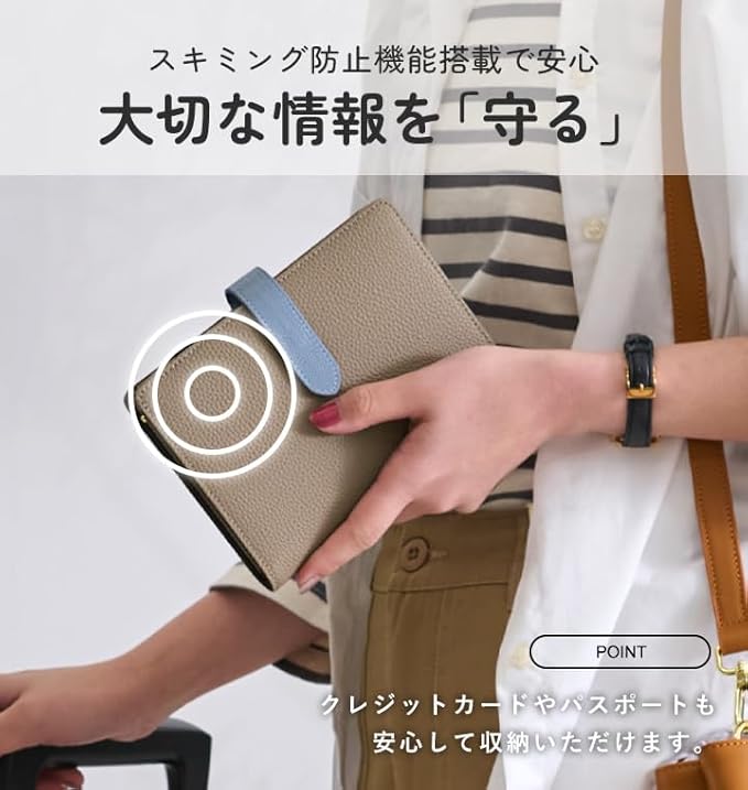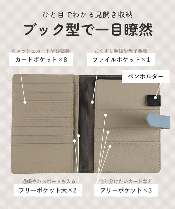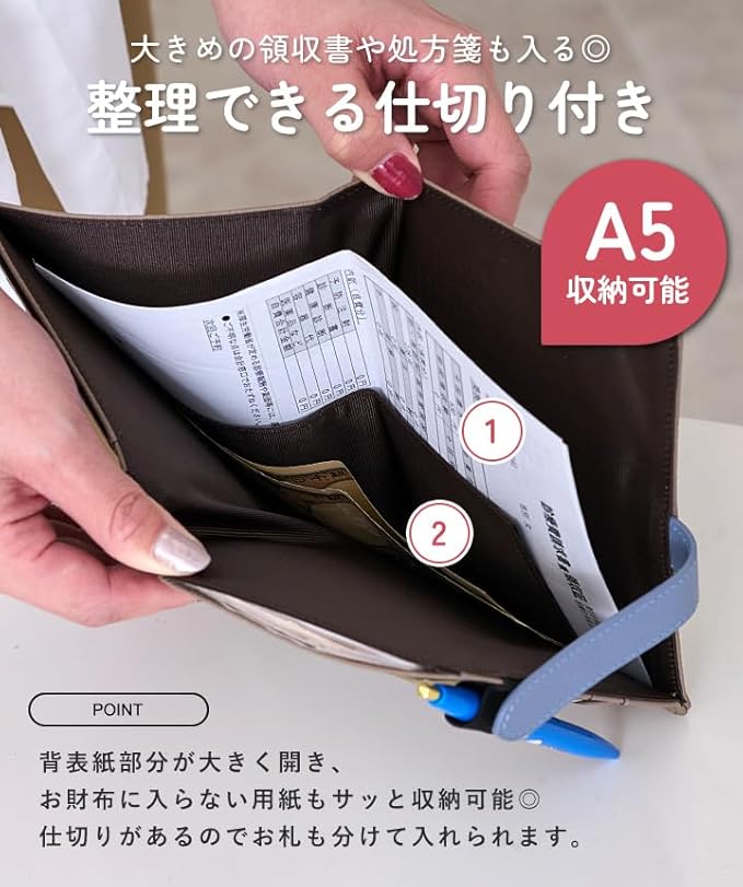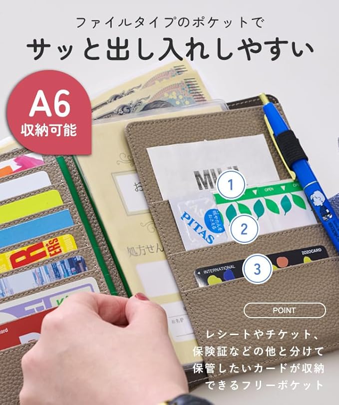 お薬手帳や診察券など病院に行くときに 必要なアイテムを入れて通院ケースに、 通帳やカード類、現金を入れて家計管理用に、 スキミング防止機能も搭載されているので パスポートケースとしても◎