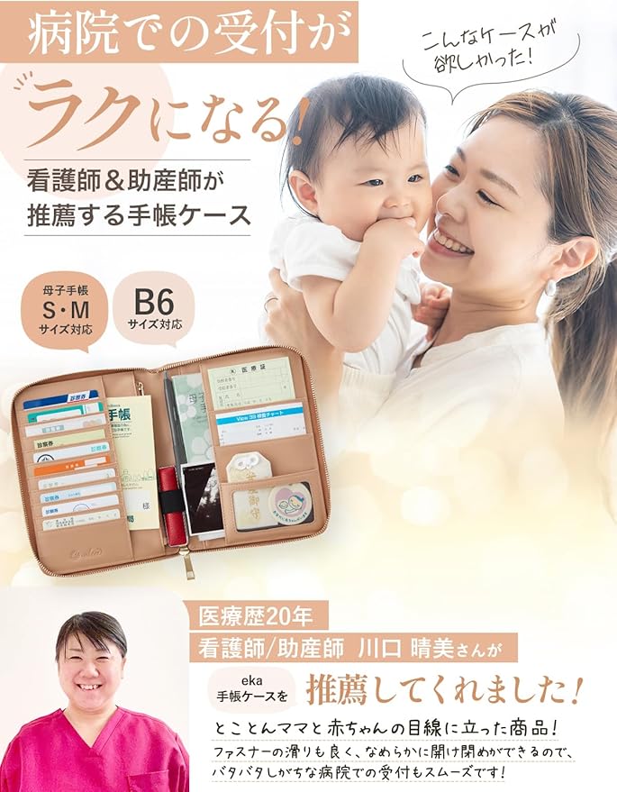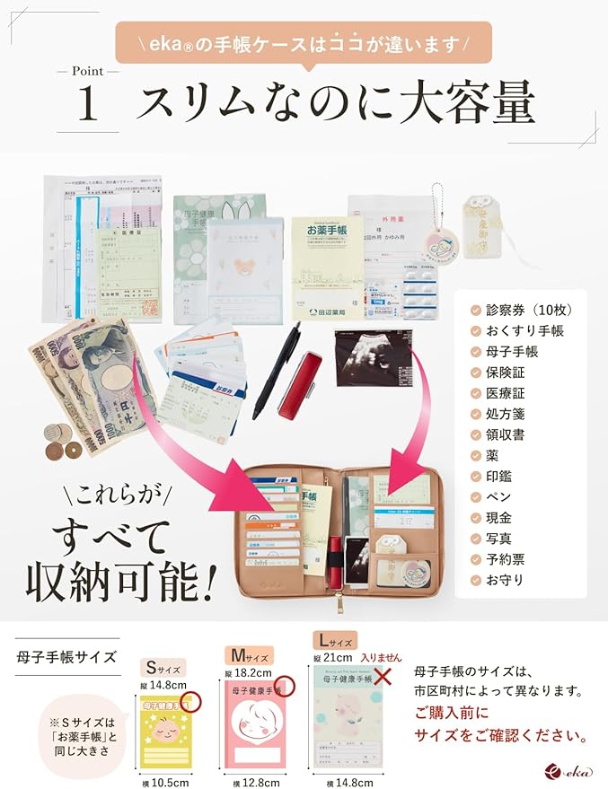 【ご注意】 お客様より「サイズが大きい」というお声を頂きましたので、お答えします。母子手帳のサイズは3種類(SML)あり、お住まいの市区町村によって異なります。「Mサイズだと入らない」というお声をいただき、S・M両方のサイズが入るケースを開発しました。また、子どもが1人の場合、母子2人分の通院グッズが一つのケースにまとまるよう、大きめに作りました。ご注文の際は、サイズをご確認の上、お買い求めいただけますよう、お願い申し上げます。