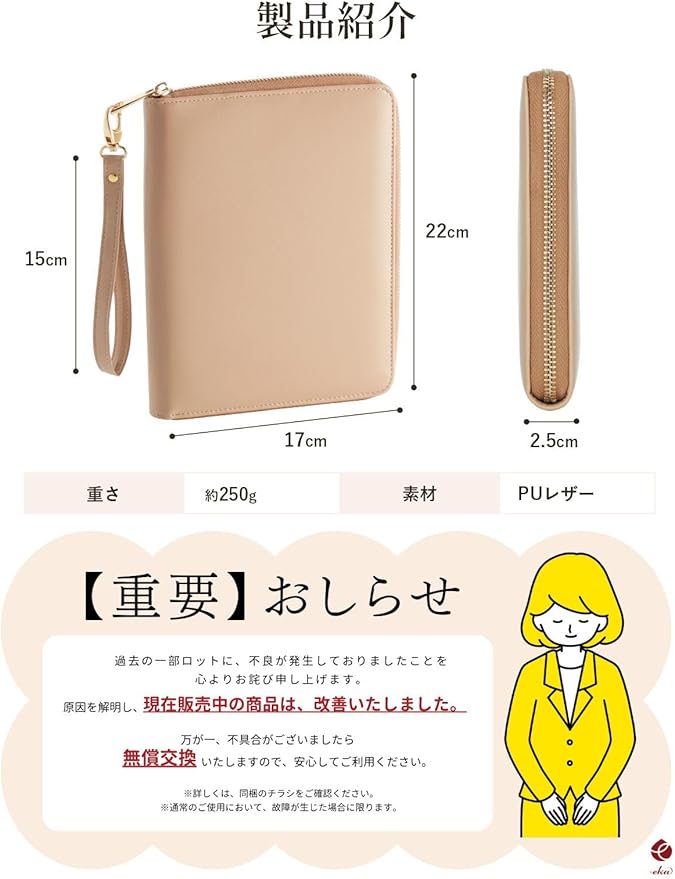 【製品仕様】素材: PUレザー、サイズ:22㎝ 17㎝ 2.5㎝、重さ:約250g、カラーは3色(エクルベージュ、ベビーブルー、ペールピンクからお選びください)