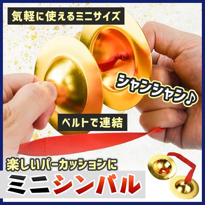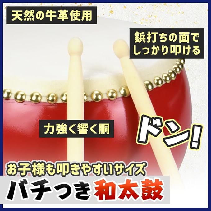 本体は自宅でも演奏しやすいよう、ミニサイズに仕上げました。和太鼓の他にミニシンバルも付属するため、カラオケ・新年会・お遊戯会・運動会・お祭りなどの場を盛り上げられます。※天然素材のため打面部分に着色やまだら模様がある場合がございますが、音色には問題ございません。
