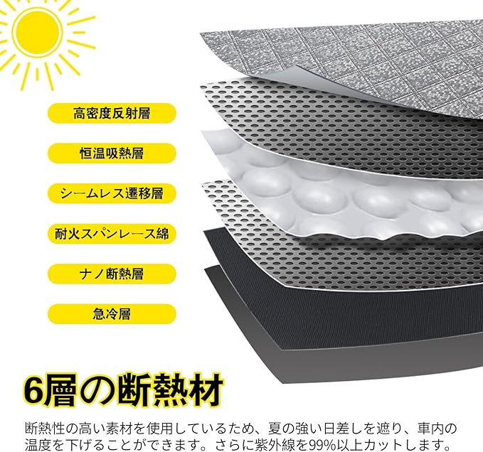 6層構造]:冬場、窓からの冷気の侵入を防ぎ、車内の温度を保ち、車中泊を快適にします。エアコンの効率を向上させ、エネルギーを節約。従来品に比べ、遮光・断熱性能が大幅に向上し、夏は低温、冬は高温になる。空調効率を向上させ、省エネを実現します。ブラックメッシュ仕上げ。