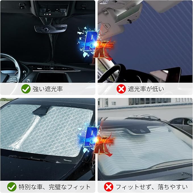 [多目的]:サンシェードはフロントガラスに使用され、多機能の目的を持っています。フロントガラスからの太陽光を効果的に遮り、プライバシーも保護します。停車中は車内の温度上昇を抑え、走行中は眩しさを軽減し、運転の安全性と快適性を向上させます。