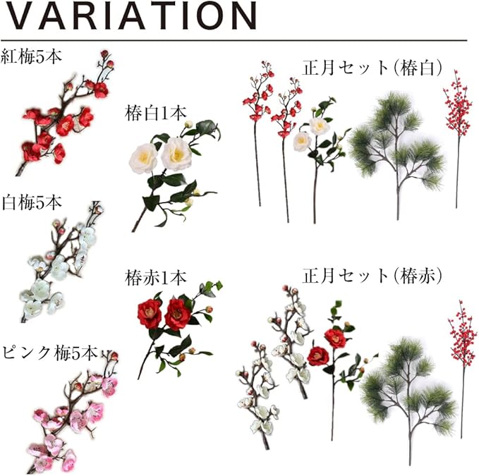 3タイプのアーティフィシャルフラワーをご用意しました。梅の各色の5本セット。椿紅白各1本。花瓶にそのまま飾っていただいて様になるお正月セット。お好みでチョイスください。