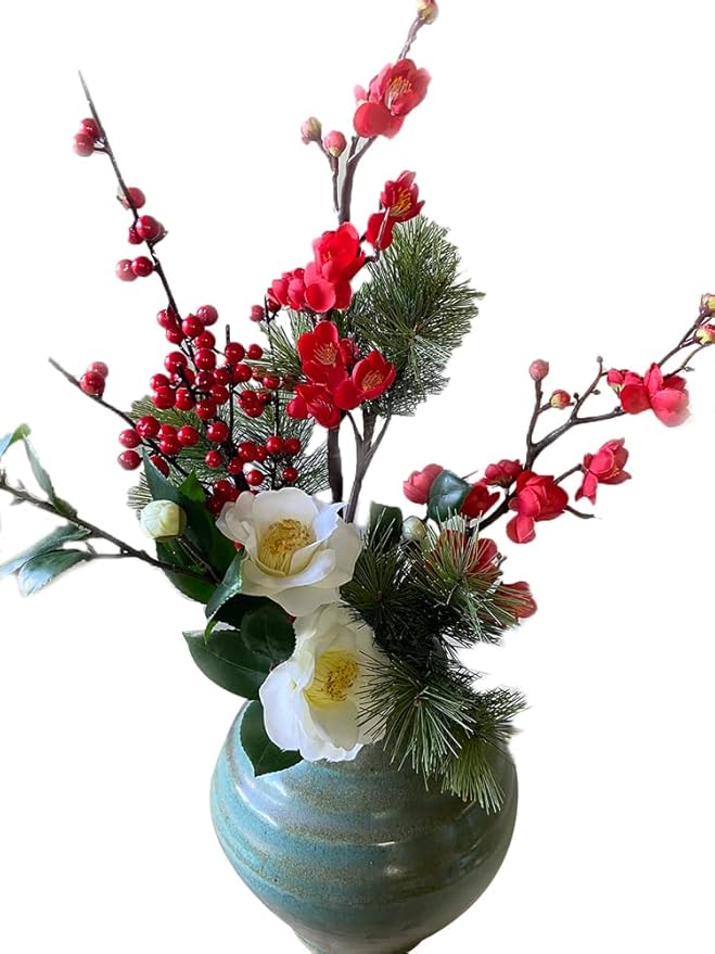 正月 飾り 梅 椿 松 造花 生け花 フェイク 和風 装飾 インテリア 新年 花束 (正月セット 椿白)