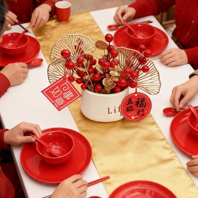 「にぎやかなデザイン」お正月雰囲気満点なお正月造花セットです。赤い実とゴールドの葉が自然的に組み合わせて、この造花セットを作成されています。赤い実は発泡体で作られ、本物の果実のように色鮮やかで、表面に光泽があります。祭りや好みに合わせて、花の枝にお祝いの言葉が書かれたカードをかけることができます。