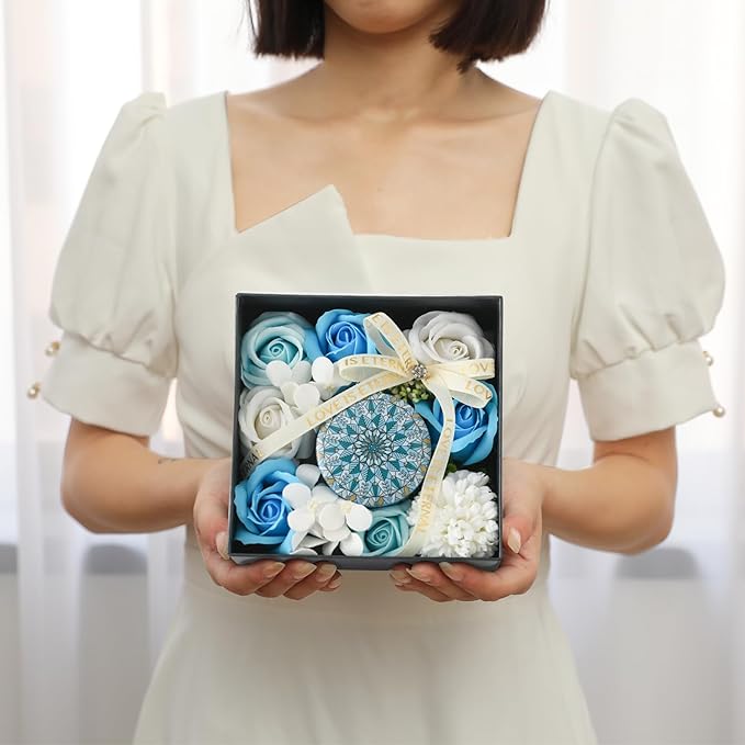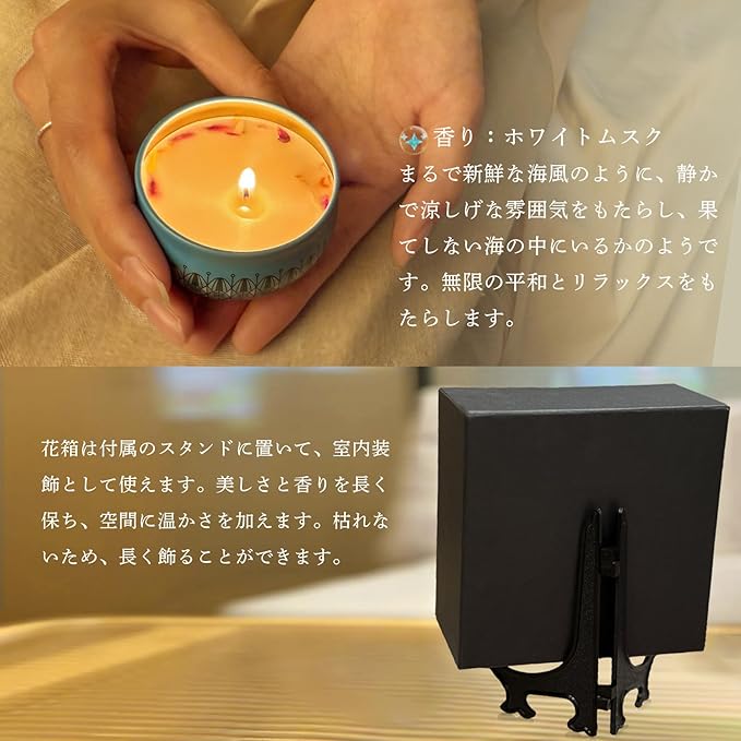 ③ギフトボックス入りソープフラワー:いつでも贈れるように、特別におしゃれな手提げ袋を用意しました。花箱のサイズは15 15 7.4センチで、アロマキャンドルが含まれています。見た目も上品で、ギフトとして完璧な選択です。総重量は約247グラムです。また、無料のメッセージカードとスタンドも付属しており、伝えたい気持ちを自由に書いて飾ることができます。心のこもったギフトをお届けします。