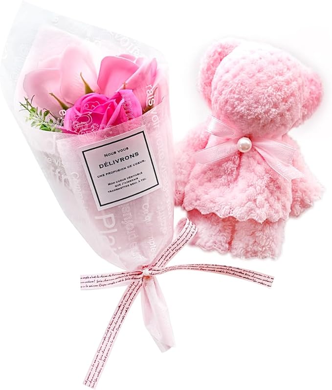 贈り物に最適なセット: 高級感のあるプチブーケと可愛らしいタオルベアが含まれています。卒業、入学、結婚式の送り迎えなど、様々な場面でご利用いただけます。