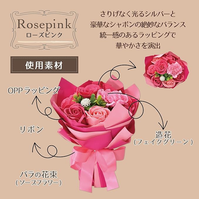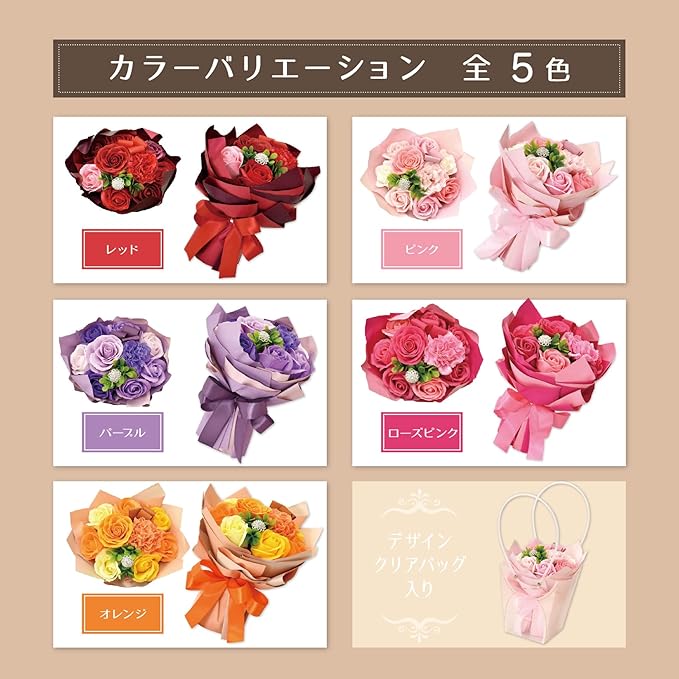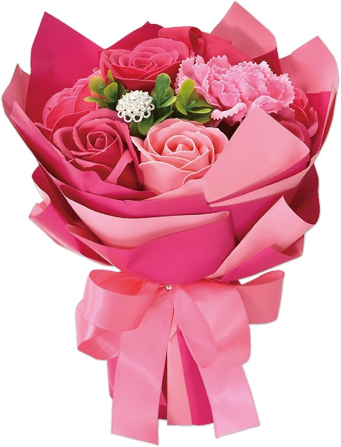 【ソープフラワーの特徴】花びら1枚1枚が石けん素材で作られた観賞用のお花です。プリザーブドフラワーと比べて花弁が大きく、値段がお手頃、石けんのいい匂いがふんわりと香るので人気があります。 生花のように水やりやお手入れの必要がなく、枯れる心配も虫や花粉の心配もありません。