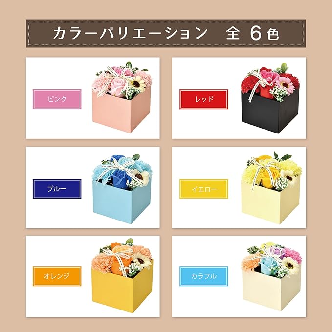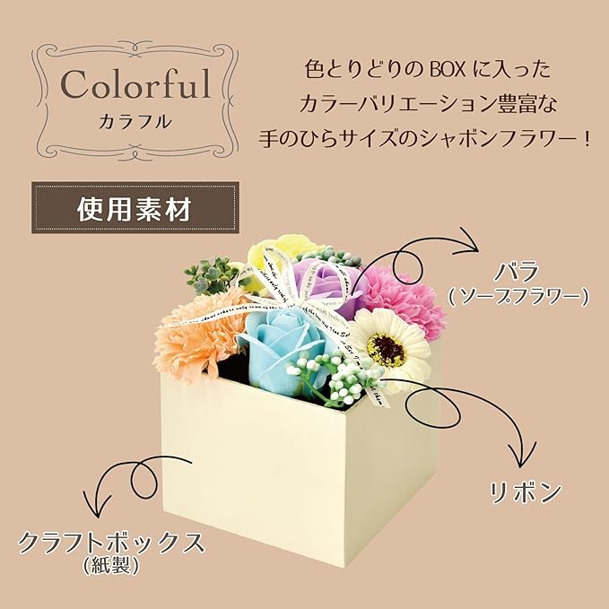色とりどりのBOXに入ったカラーバリエーション豊富な手のひらサイズのシャボンフラワー!