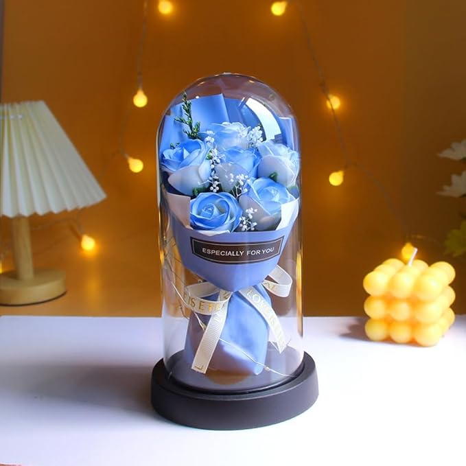 フレグランスソープフラワー フェアリー 6輪ローズ カーネーション ギフトボックス バラ ガラスドーム LEDライト 枯れない花 造花 シャボンフラワー お祝い 還暦祝い 退職祝い 記念日 お見舞い ギフト (ブルー) | etshop
