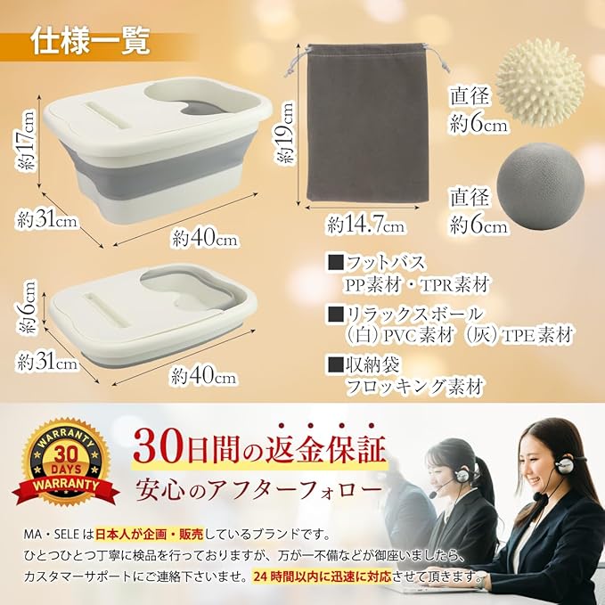 【セット内容】フットバス 1点 リラックスボール 2種 ボール用収納袋 1点 ガイド解説書 【サイズ(約)】<フットバス>展開時:40cm 31cm 17cm 折り畳み時:40cm 31cm 6cm <リラックスボール>イボイボ白:直径6cm ツルツルグレー:直径6cm 【材質】フットバス:PP素材/TPR素材 リラックスボール(イボイボ白):PVC素材 リラックスボール(ツルツルグレー):TPE素材 リラックスボール用収納袋:フロッキング素材