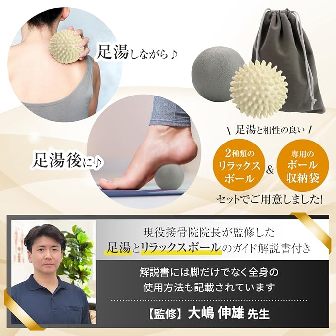 フットバスに加えて、表面がツルツル/トゲトゲの異なる形状のリラックスボールを2種類セットでご用意致しました。どちらも硬いタイプなので力が弱くても気持ち良く刺激を与えることができます。柔らかすぎると物足りないと感じている方にピッタリです。リラックスボールの持ち運びや保管に重宝する収納袋も付属します。