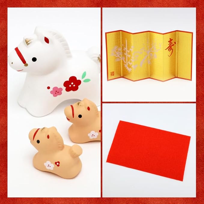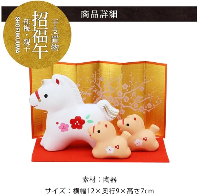 大阪長生堂 干支飾り 干支置物 午 馬 ウマ うま 十二支飾り 正月飾り 陶器 オリジナル木札無料特典付(別送) 紅梅親子