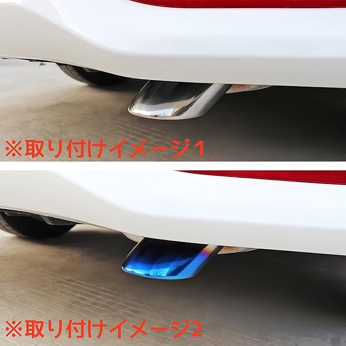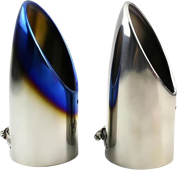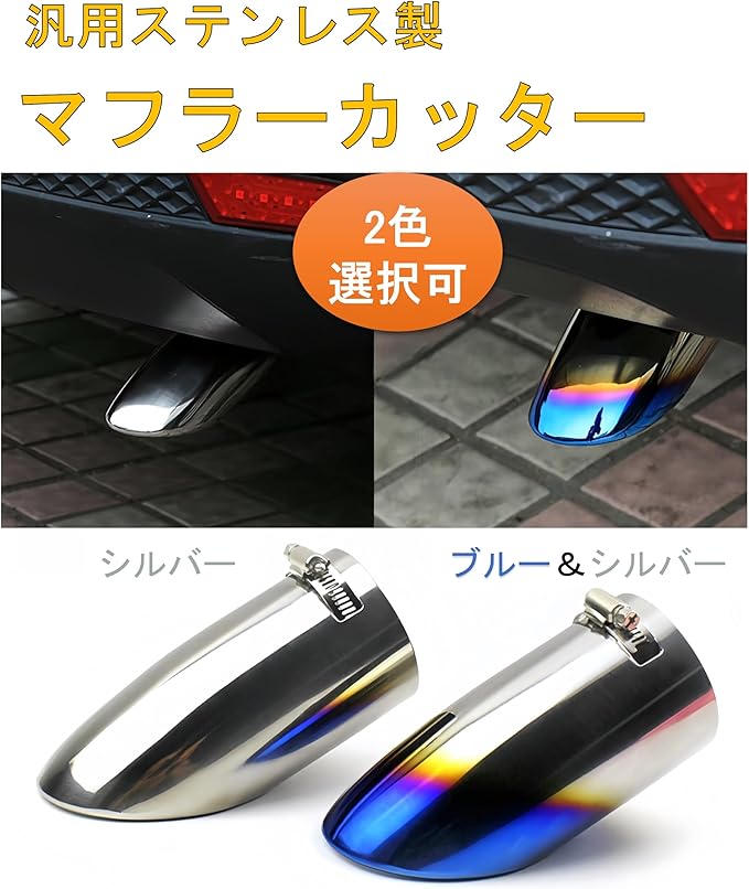 マフラーカッター 汎用 軽自動車 乗用車 車 ドレスアップ カスタムパーツ DIY 車外装パーツ カー用品 初心者 改造 簡単取り付け ステンレス製 斜めカット (ブルー&シルバー)