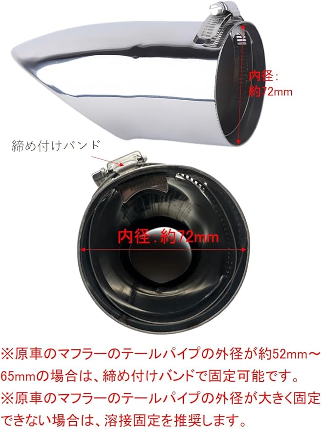 原車のマフラーのテールパイプの外径が約52mm~65mmの場合は、締め付けバンドで固定可能です。