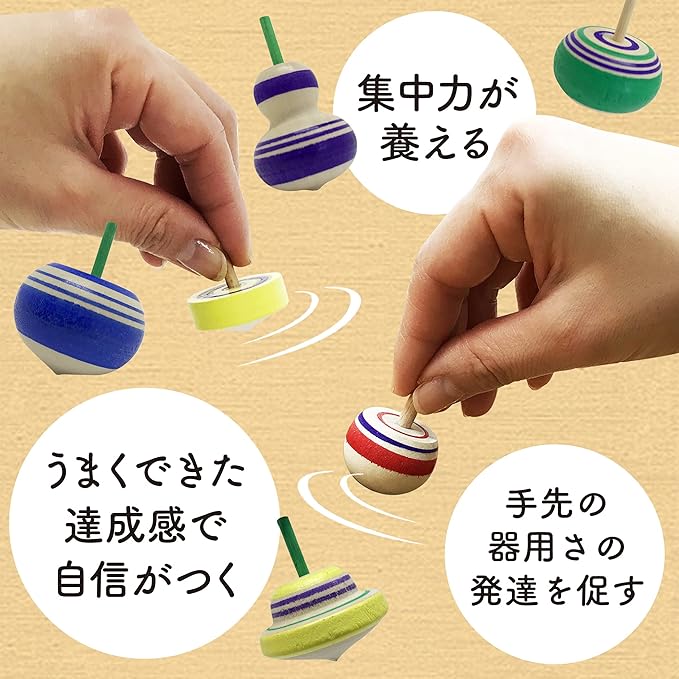 【学べて遊べる知育玩具】コマで遊ぶと手先の器用さや指先の筋肉の発達を促せます。また回すことができたら対戦相手を決めて勝負をすれば自然と集中力や競争心が高められ、まさに遊びながら学べる木のおもちゃです。