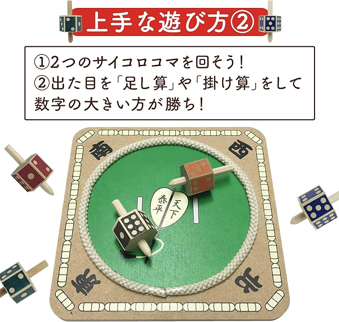 【頭の体操になる民芸玩具】コマを回して出た目を足し算や掛け算などして数字が多い方が勝ち!などさまざまなルールを決めて遊べます。遊びながら計算し頭の体操になる知育玩具です。